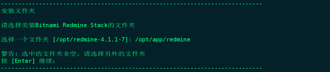 继续执行命令./bitnami-redmine-4.1.1-7-linux-x64-installer.run。