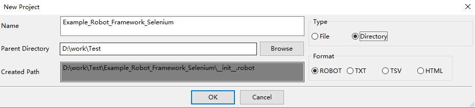 (1)打开RIDE编辑器,选择File——>New Project,新建一个Robot Framework Web自动化测试项目,项目名称推荐以“公司名称”+“Robot Framework标识”+“Web自动化框架”的形式来命名,例如实战的项目名称:Example_Robot_Framework_Selenium