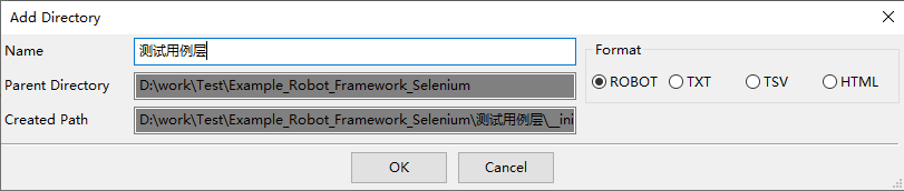 (2)选中Example_Robot_Framework_Selenium项目,单击鼠标右键,在弹出的菜单中选择New Directory,新建目录,目录名称为“测试用例层”