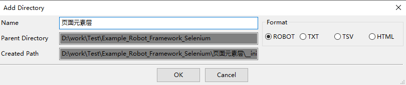 选中Example_Robot_Framework_Selenium项目,单击鼠标右键,在弹出框中选择New Directory,新建目录,目录名称为“页面元素层”