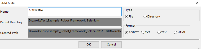 选中Example_Robot_Framework_Selenium项目,单击鼠标右键,在弹出的菜单中选择New Directory,新建目录,目录名称为“公共组件层”