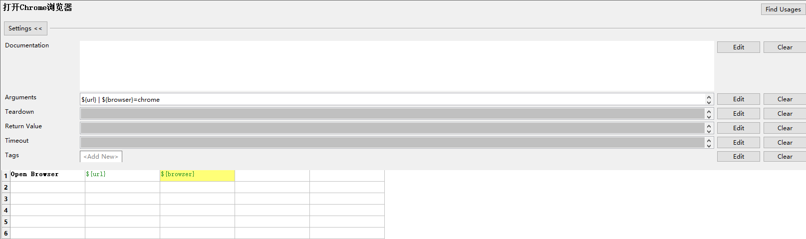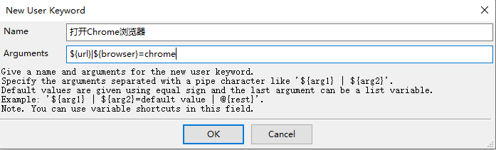 --》在“浏览器”资源文件中,新建一个名称为“打开Chrome浏览器”的关键字,关键字中接收一个地址参数和浏览器参数,其中浏览器参数默认值为chrome,通过调用Open Browser方法来打开狮子指定${url}地址