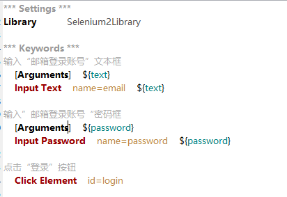 关键字名称定义为:输入“邮箱登录账号”文本框,输入“邮箱登录密码”密码框、单击“登录”按钮关键字