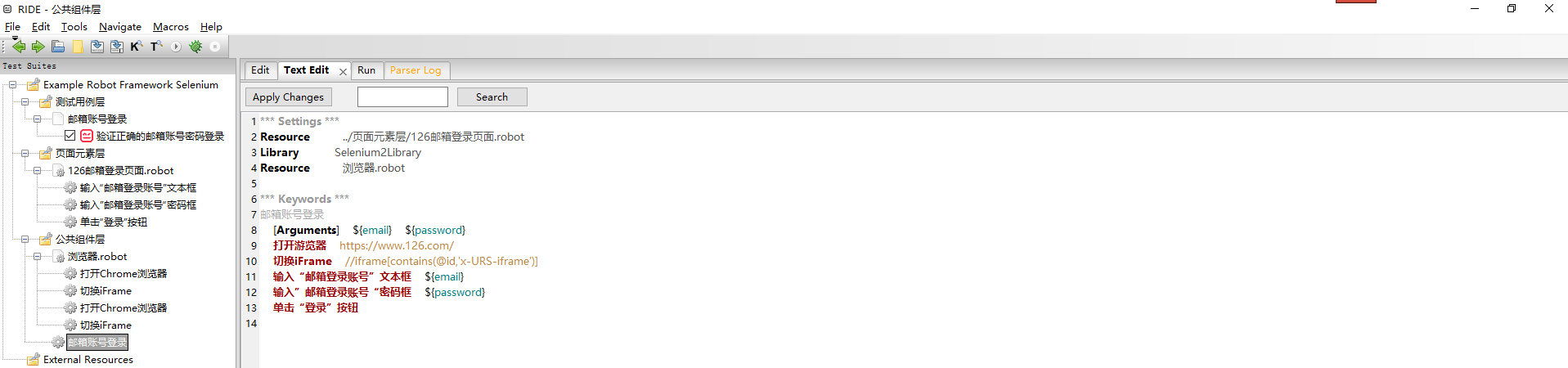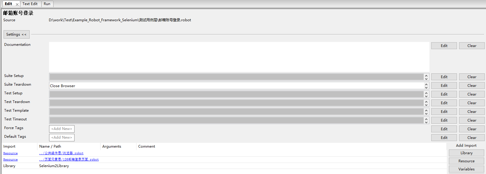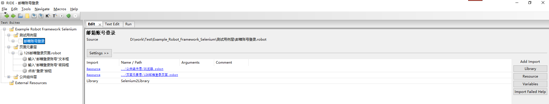 --》在“邮箱账号登录”测试套件中,导入公共组件层中的“浏览器”资源文件,再导入页面元素层中的“126邮箱登录页面”资源文件
