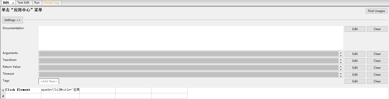 --》在“邮箱登录成功跳转首页”资源文件中,导入Selenium2Library库,并新建关键字:单击“应用中心”菜单