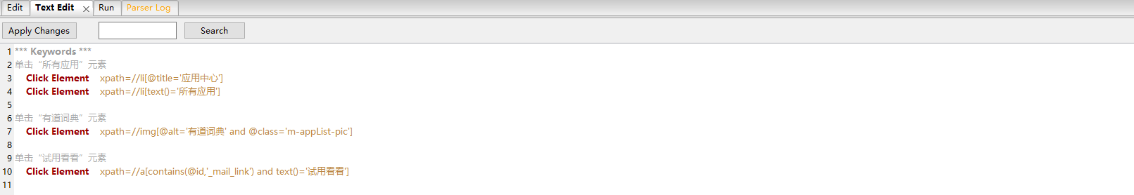 --》在“应用中心页面”资源文件中,依次创建关键字:单击“所有应用”、单击“有道词典”元素、单击“试用看看”元素