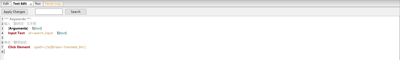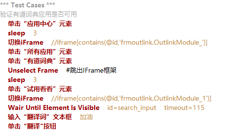 --》在“有道词典页面”资源文件中,创建输入“翻译词”文本框,并接收一个参数#{text}用于输入翻译词,再创建一个名为单击“翻译”按钮的关键字