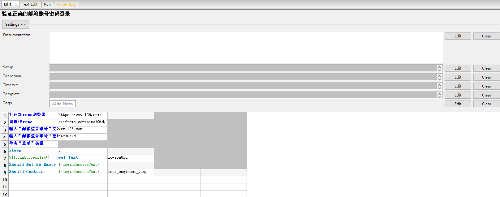 在Suite Setup中添加“邮箱账号登录”关键字;在执行测试套件之前,先执行邮箱账号登录操作,以确保执行测试套件下的用例是处在登录状态下的