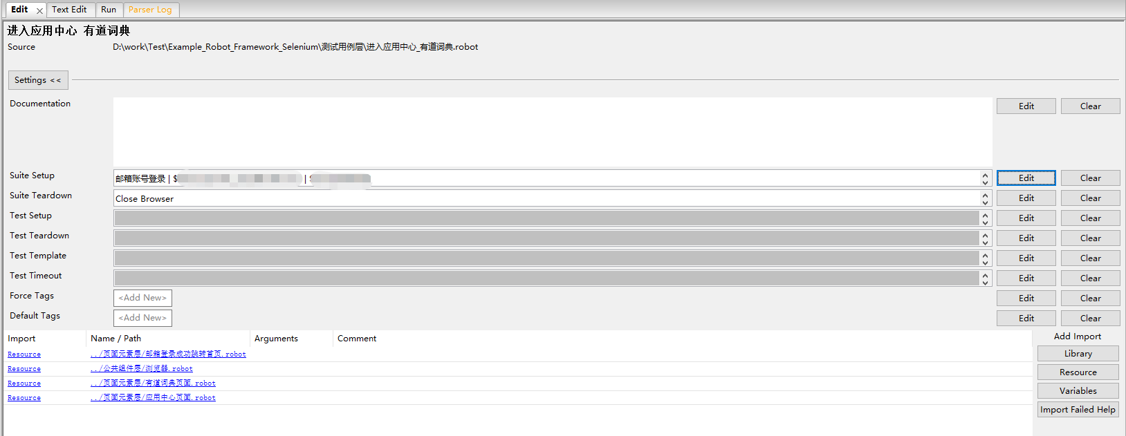 --》在“进入用用中心_有道词典”测试套件的Setting配置中,导入公共组件层中的“浏览器资源文件,和页面元素层中的“邮箱行号登录”关键字