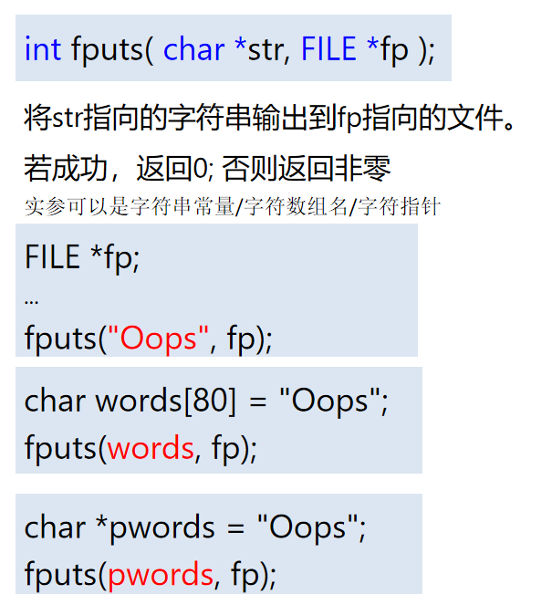 ch = fgetc(fp); // 从fp指向的文件中读取一个字符,赋给ch fputc(ch, fp); // 将ch中的字符写入fp指向的文件while(!feof(fin) // 判断文件是否处于文件结束位置,如文件结束,则返回值为1,否则为0。 fgets(text, 11, fp); // 从fp指向的文件中读入字符串到字符数组text字符串中,长度不能超过10。(n-1) fprintf(fp,"%s\t%s\n","姓名","分数"); // 向fp指向的文件格式化写入数据。 fscanf(fp,"%s%f",name,&score); // 从fp指向的文件中格式化读入数据。 size_t fread( void *pt, size_t size, size_t n, FILE *fp );