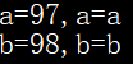 #include <stdio.h> int main(){ int a=97; char b='b'; printf("a=%d,a=%c\n",a,a); printf("b=%d,b=%c\n",b,b); return 0; }