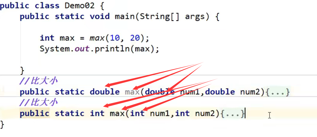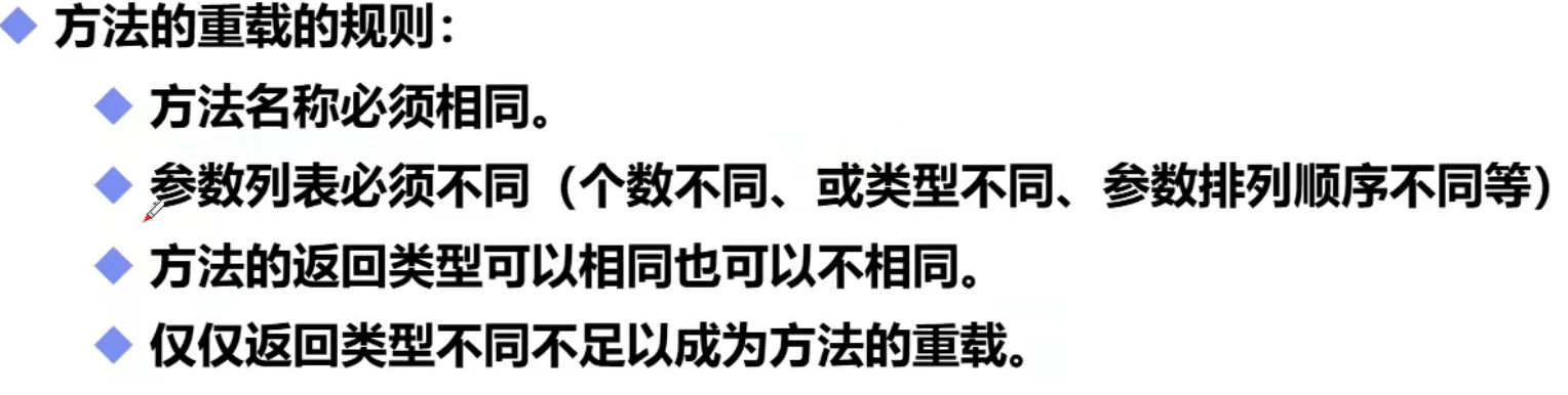 - 方法的重载:在同一个类中,有着相同的函数名称,但是形参不同的函数