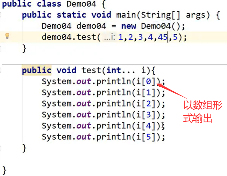- 在方法声明中,在指定参数类型后加···,一个方法中只能指定一个可变参数,它必须是方法的最后一个参数;