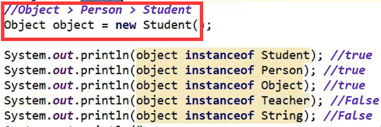 - instanceof:判断两个类之间是否存在父子关系;左边是对象,右边是类,当对象是右边类或子类创建的对象时,返回true;