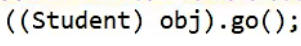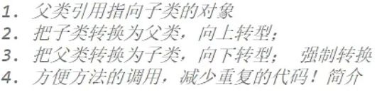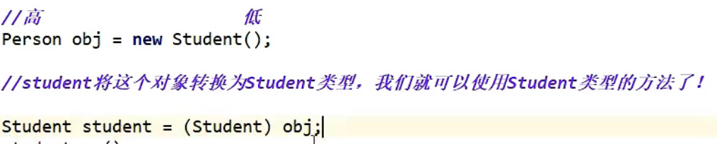 - 类型转换:低转高:不需要强制类型转换;高转低:类型 标识符 = (类型)变量名;子类转化为父类可能丢失自己本来的一些方法->Person person = student;