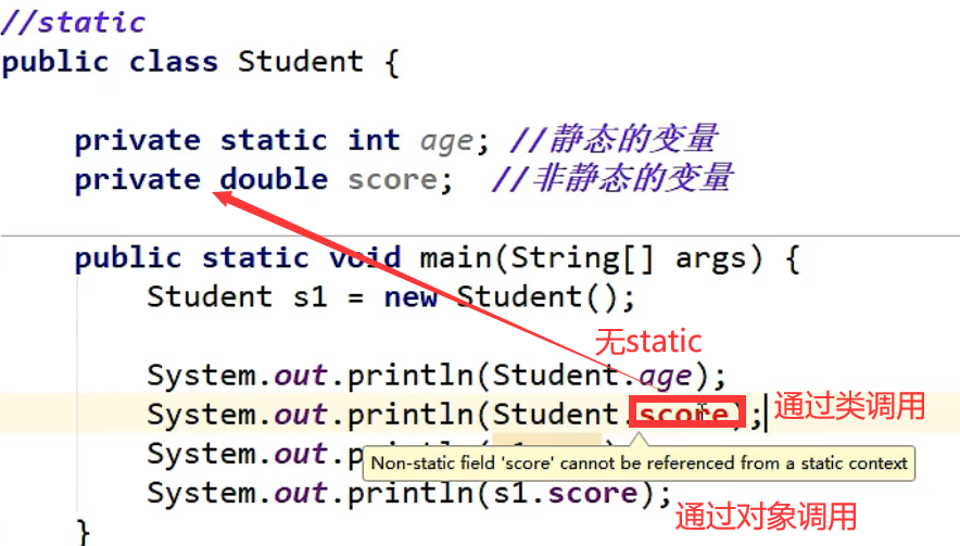 无法通过类调用非静态属性 - 静态方法:非静态方法可以直接调用静态方法,静态方法也可以直接调用静态方法,但不能直接调用非静态方法,需要先new一个对象,原因是static修饰的的方法和类一起加载;