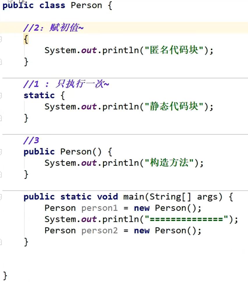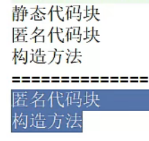 - 代码块:匿名代码块:创建对象时自动创建在构造器之前;静态代码块:类一旦加载直接执行