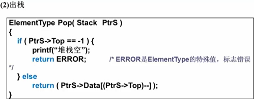 - 入栈:包含两个参数,一个是堆栈本身(这里用一个结构指针表示);Top-1表示堆栈空;由于数组有界限,进行操作前应首先判断堆栈满不满