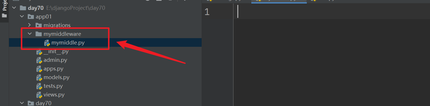 # 注册自己的中间件(在应用下创建路径有提示,但是如果在项目下创建就没有提示了 你就需要自己比对着书写)