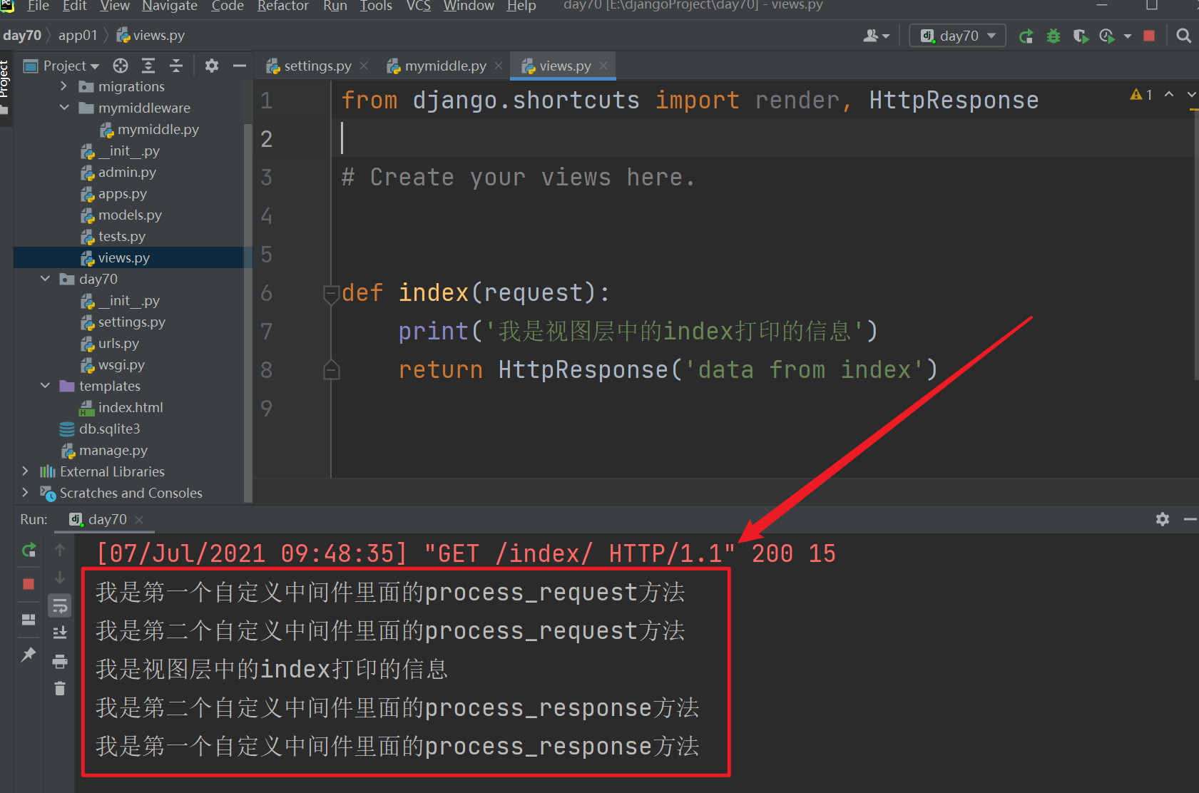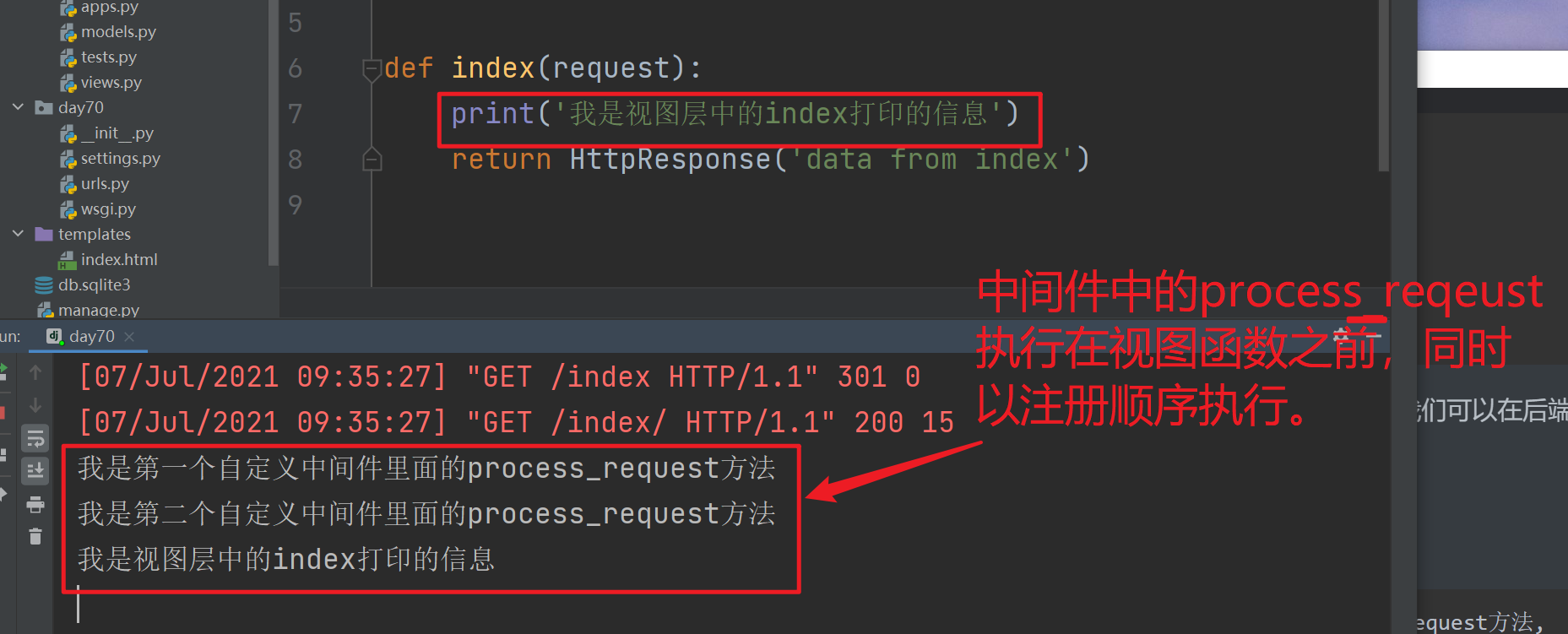 # 必须有一个request参数,携带请求的内容,所以在中间件中可以先视图层进行操作