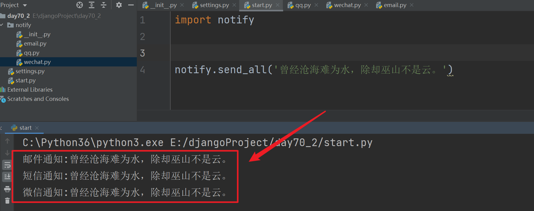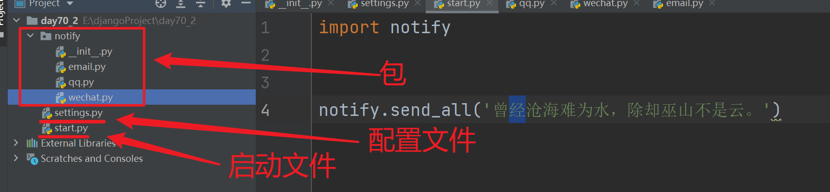 我们先建立一个settings.py文件,再建立一个notify文件夹,文件路径如图。