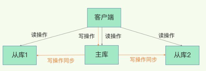 主从模式就是,部署多台Redis节点,其中只有一台节点是主节点(master),其他的节点都是从节点(slave)。主从模式实现读写分离,只有master节点提供数据的事务性操作(增删改),slave节点只提供读操作。所有slave节点的数据都是从master节点同步过来的,该模式的结构图如下: