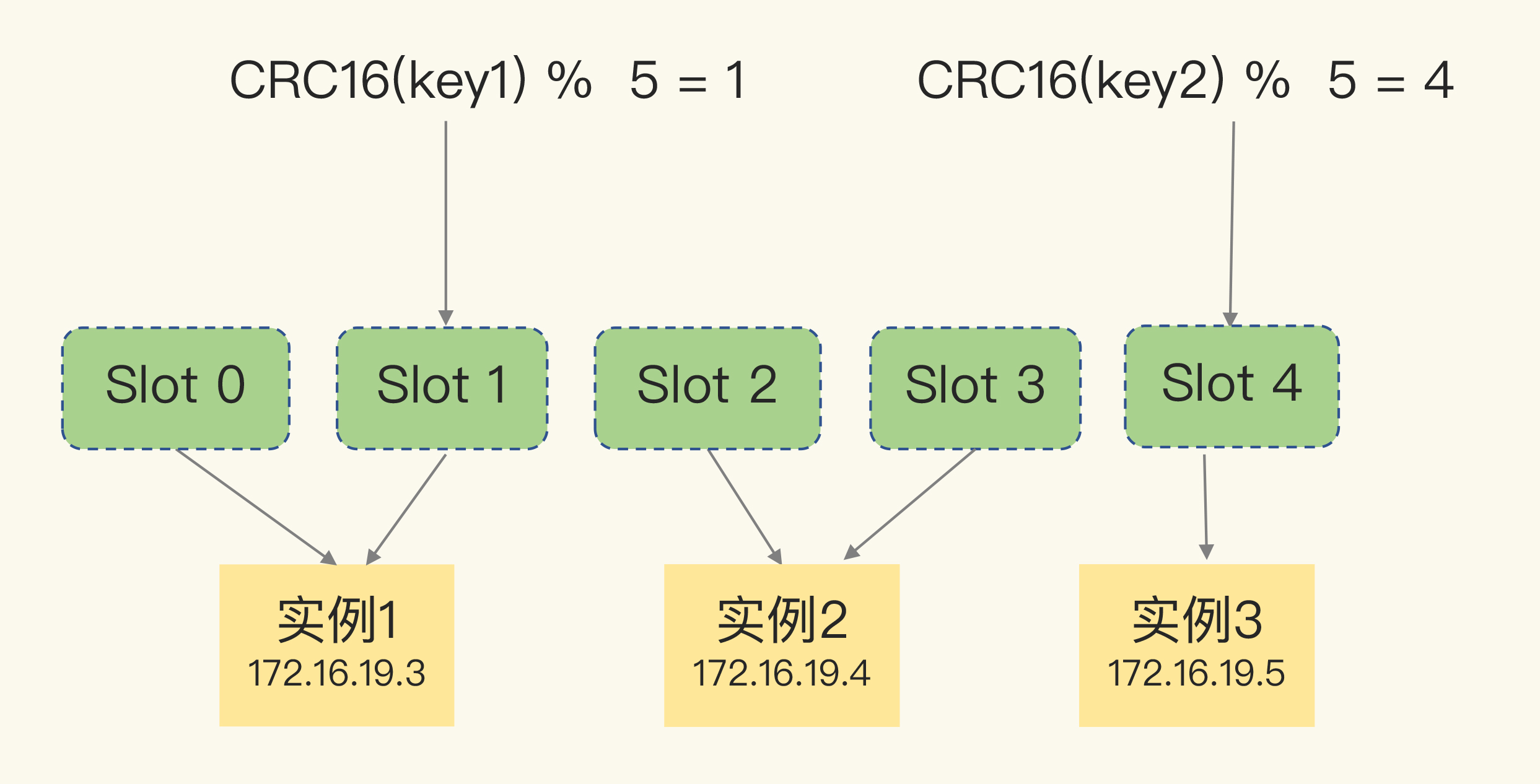 在集群运行的过程中,key1 和 key2 计算完 CRC16 值后,对哈希槽总个数 5 取模,再根据各自的模数结果,就可以被映射到对应的实例 1 和实例 3 上了。