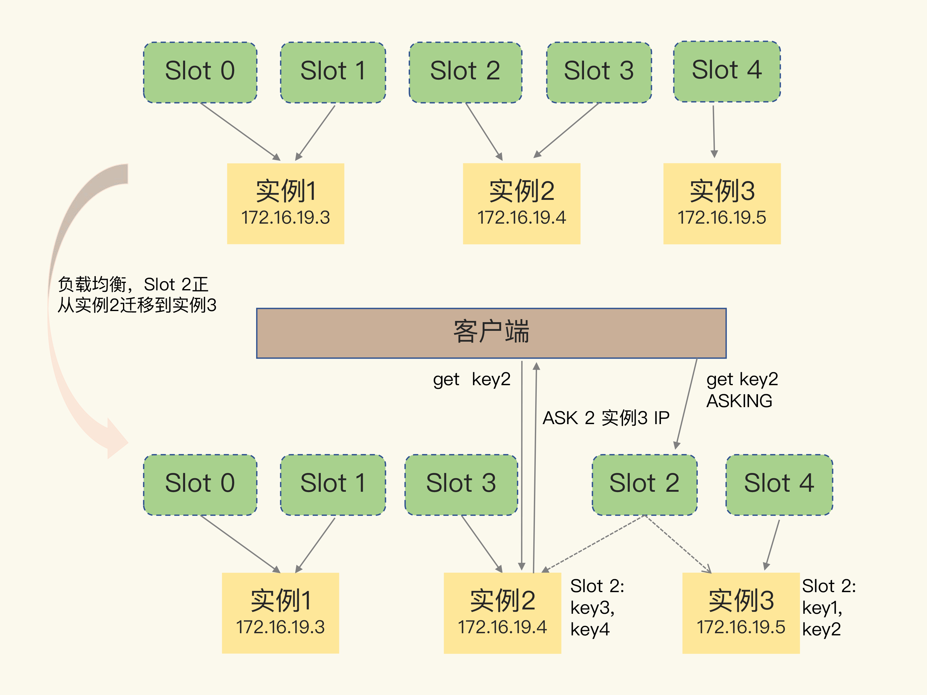 和 MOVED 命令不同,ASK 命令并不会更新客户端缓存的哈希槽分配信息。所以,在上图中,如果客户端再次请求 Slot 2 中的数据,它还是会给实例 2 发送请求。这也就是说,ASK 命令的作用只是让客户端能给新实例发送一次请求,而不像 MOVED 命令那样,会更改本地缓存,让后续所有命令都发往新实例。