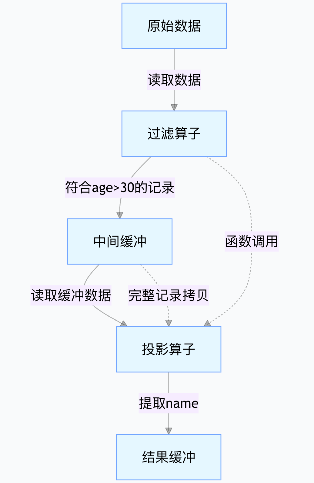 执行流程拆分为 “过滤算子” 和 “投影算子” 两个独立步骤,中间通过缓冲传递数据: