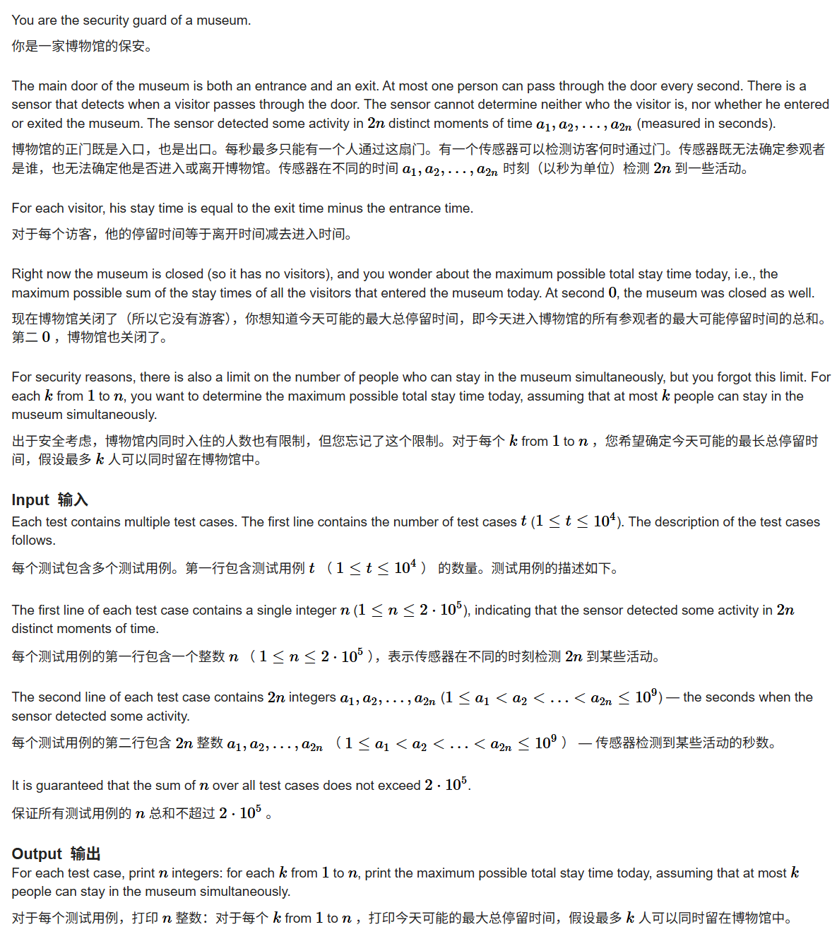 这题意思就是给你一个数n表示有多少人进出博物馆,然后再输入2×n个数,这些数表示在这个时间,有人经过了博物馆门(是进是出不知道)