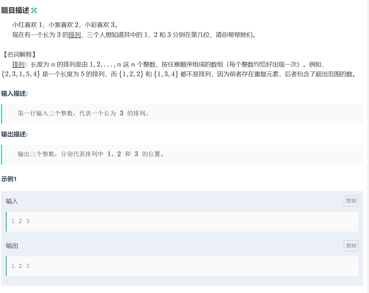 这题就是问你1,2,3这三个数分别出现在数组的哪个位置,然后输出位置就好了