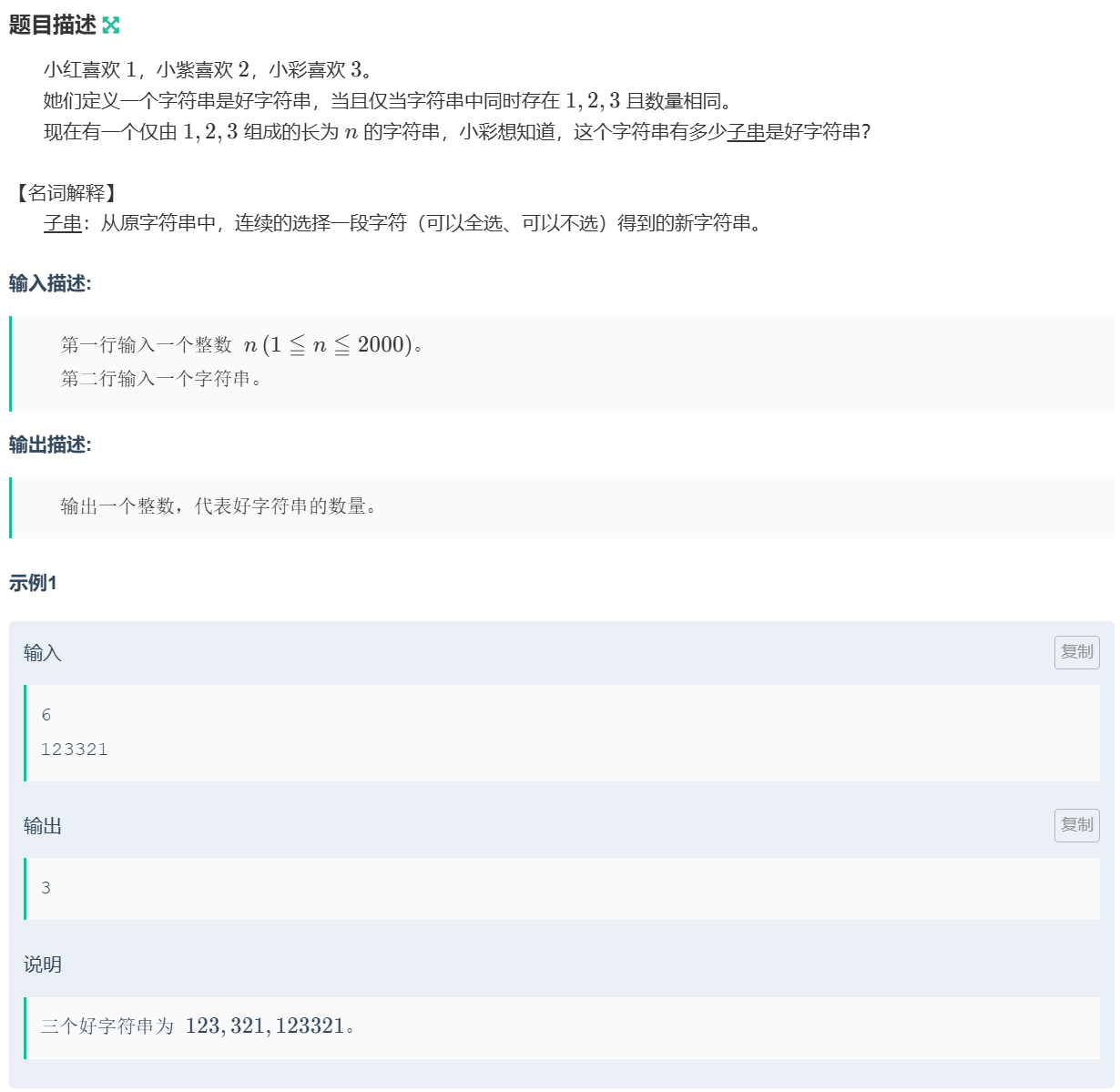 这题就是给你一个长度为n的字符串,然后问你这个字符串中有几个连续子串满足既存在1,也存在2,也存在3,并且1,2,3的个数一样
