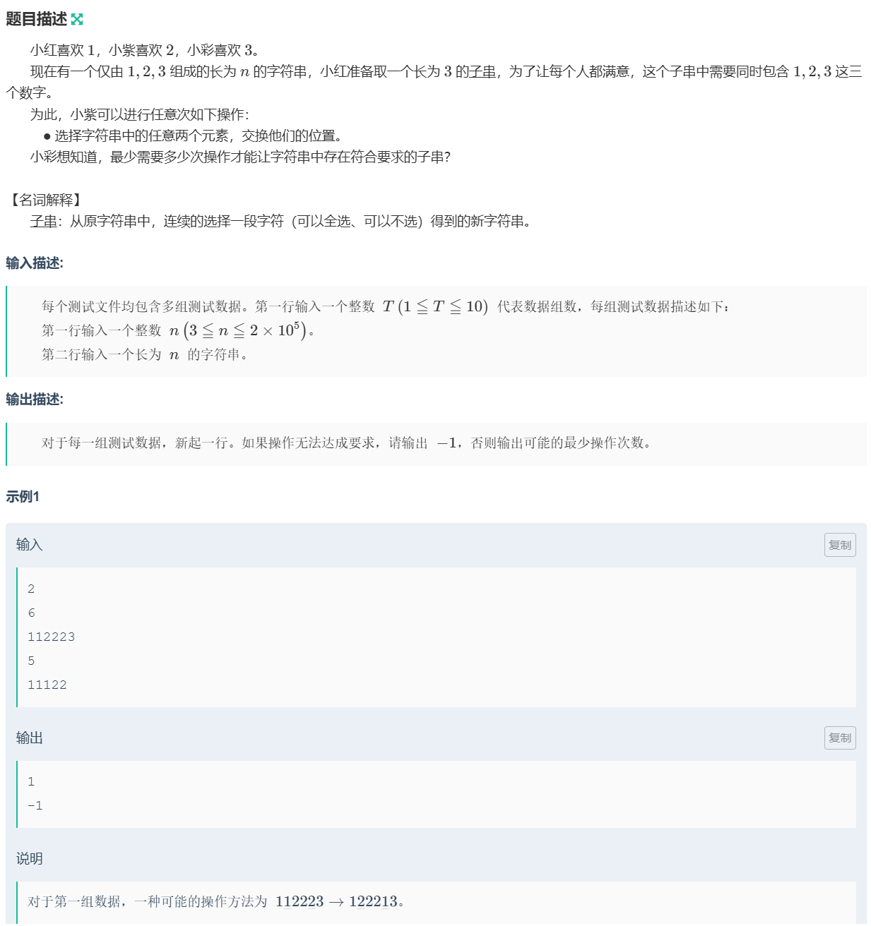 这题就是给你一个字符串,然后你可以选择任意俩个下标,交换这俩个下标对应的值,然后需要在操作n次后,字符串中存在长为3的连续子串,且该子串中有1,有2,也有3