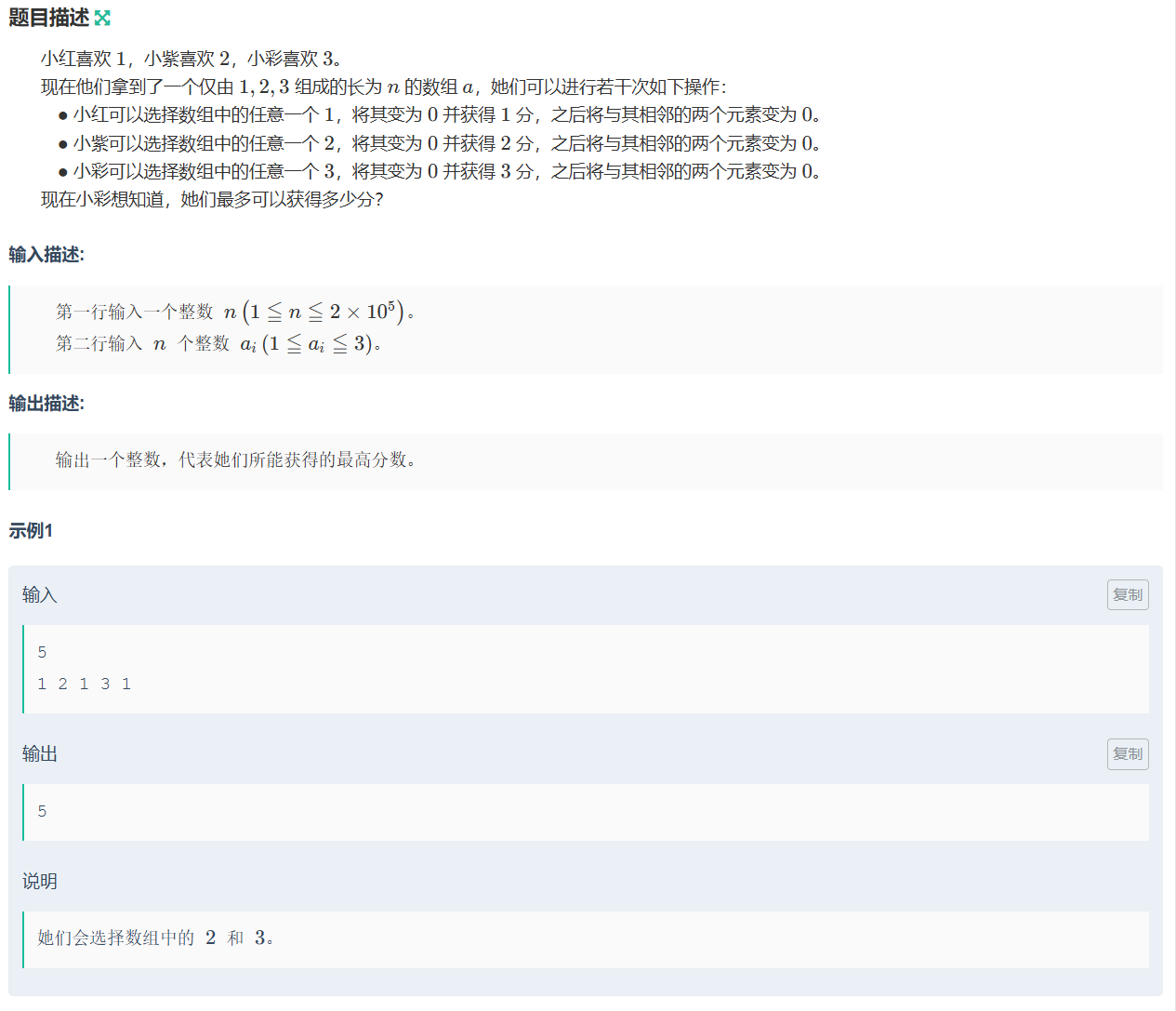 这题就是给你一个数组,然后你每次可以选择一个位置,得分加上这个位置的元素,然后将这个位置以及相邻位置的元素变成0,直到数组全部变成0