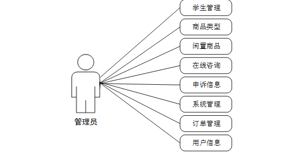 (1)、管理员关键效果包含学生、商品类型、闲置商品、在线咨询、申诉信息、系统管理、订单管理、用户信息等进行管理。管理员用例如下: