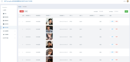 学生功能在视图层(view层)进行交互,比如点击“搜索、新增、删除或审核”按钮或填写学生表单。这些学生表单动作被视图层捕获并作为请求发送给相应的控制器层(controller层)。控制器接收到这些请求后,调用服务层(service层)以执行相关的业务逻辑,例如验证输入素材的有效性和与数据库的交互。服务层处理完这些逻辑后,进一步与内容访问对象层(DAO层)交互,后者负责具体的数据执行如查看或删除学生信息,并将操作结果返回给控制器。最终,控制器根据这些结果更新视图层,以便学生效果许可看到最新的信息或相应的处理反馈。如图5-7所示: