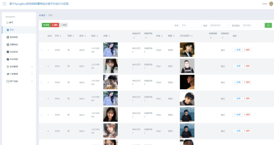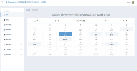 管理员进入主页面,主要功能包括对学生、商品类型、闲置商品、在线咨询、申诉信息、系统管理、订单管理、用户信息等进行操作。管理员主页面如图5-6所示: