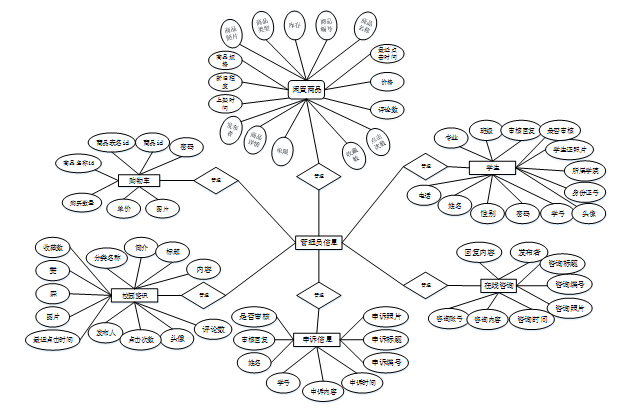 通过概念模型是对现实中的问题出现的事物的进行描述,ER图是由实体及其关系构成的图,通过E-R图能够清楚地描述系统涉及到的实体之间的相互关系。本文将“学生、闲置商品、申诉信息、购物车、校园资讯、在线咨询”等作为实体,它们的局部E-R图,如图4-2所示:
