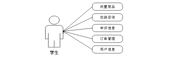 (2)、学生关键功能包含闲置商品、在线咨询、申诉信息、订单管理、用户信息等。学生用例如下: