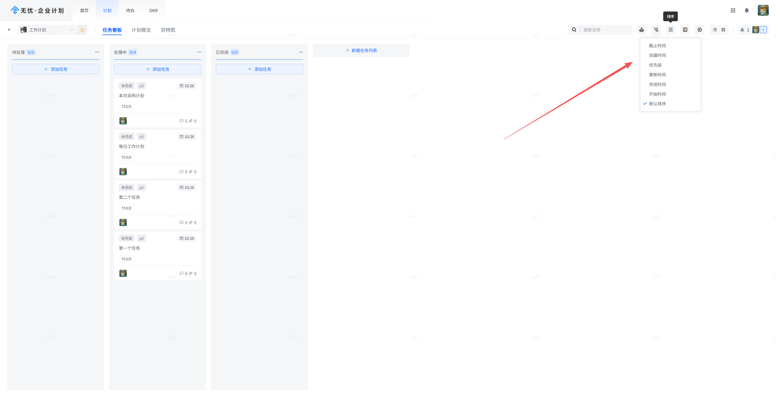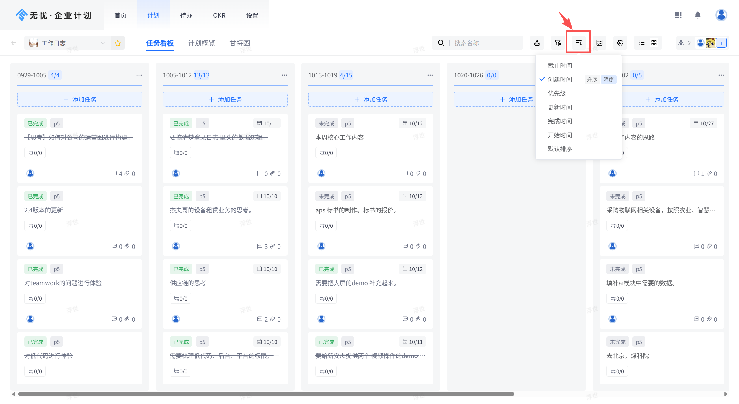 3、增加任务看板内容的排序设置,如下图所示,点击排序弹出排序维度选择,可以设置升序还是降序