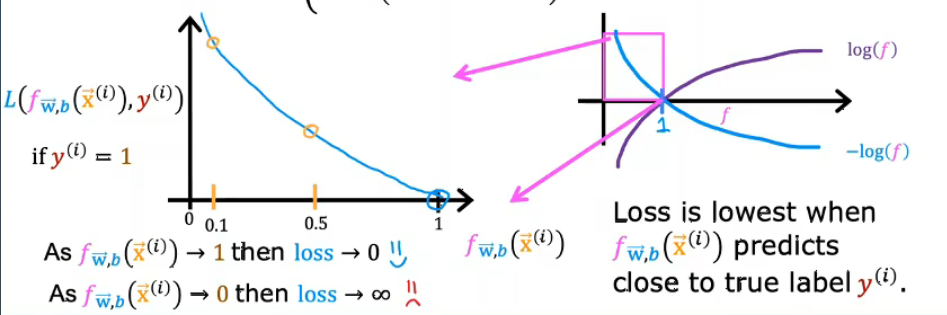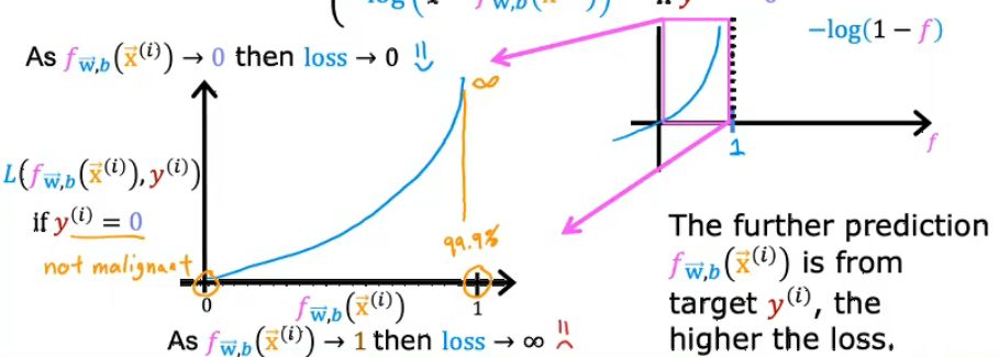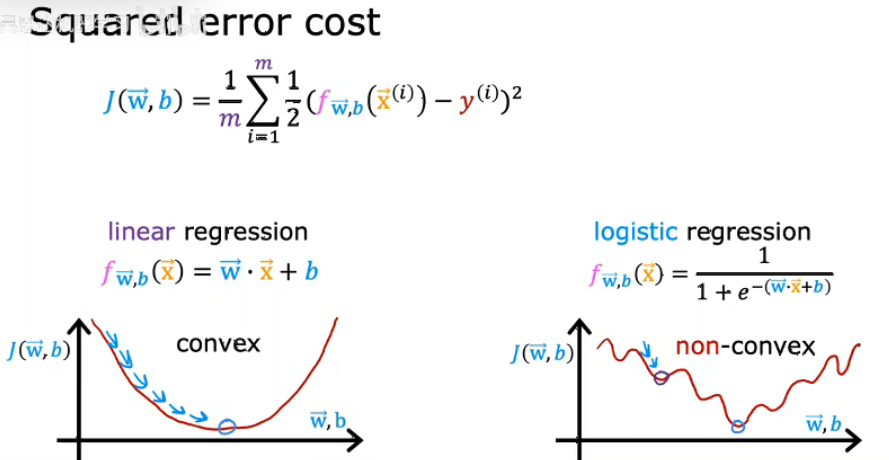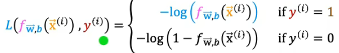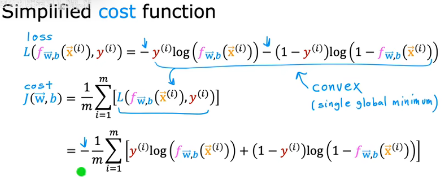 如上图所示,如果使用相同的成本函数来进行逻辑回归,并用这个f(x)值来绘制成本函数,成本函数会变成所谓的非凸成本函数,如果尝试使用梯度下降算法,将会在很多局部最小值中陷入困境,接下来介绍一种函数,它能够保证逻辑回归的成本函数是凸函数,这样梯度下降才能保证收敛到全局最小值。