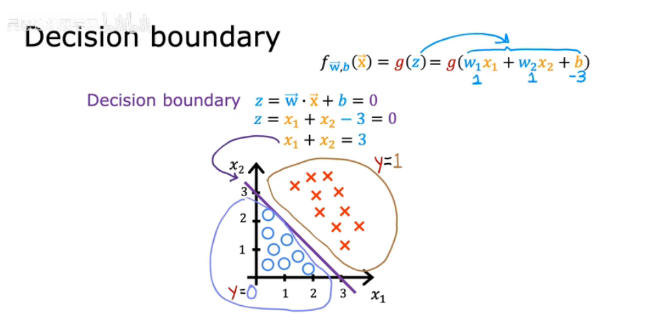 - 对于二分类问题:决策边界是把预测为类别0和类别1的区域分开的边界