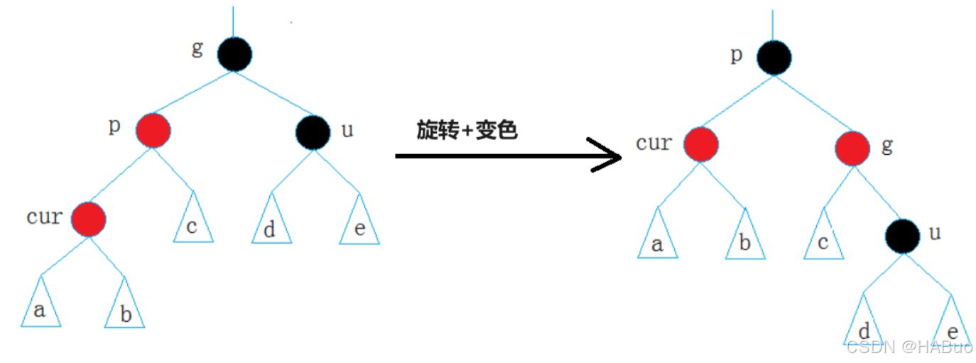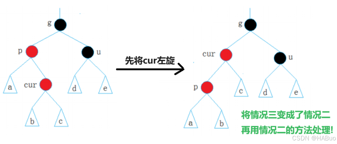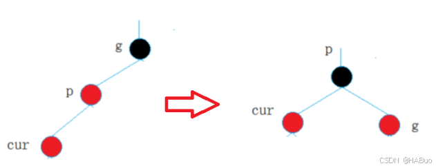 这里需要注意的是cur此时一定不是刚插入的节点,一定是上面情况2变换上来的,此时和u不存在的处理情况一致,先进行右单旋,再将p变为黑,g变为红