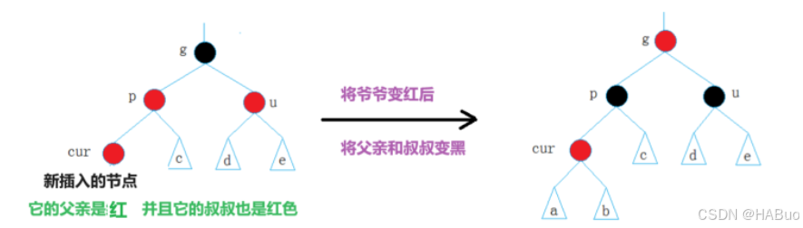情况2:cur为红,p为红,g为黑,u存在且为红,很明显,这违反了规则四,有连续的红色节点,所以此时需要做处理了!