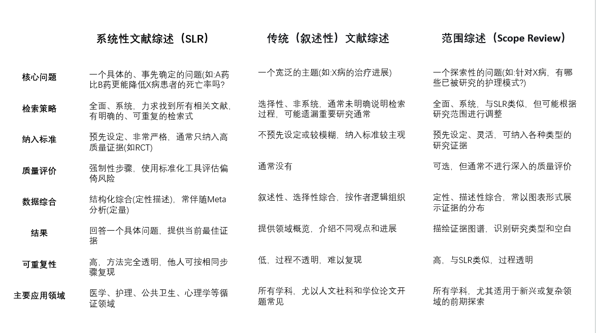 * SLR与其他综述类型的核心区别 (如下表)