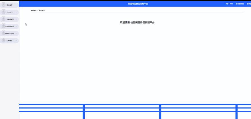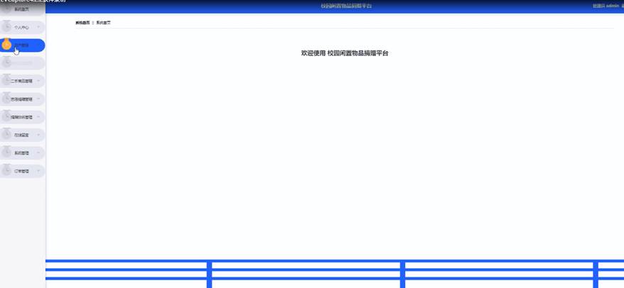 管理员登录进入校园闲置物品捐赠平台系统可以查看首页、个人中心、用户管理、商品分类管理、二手物品管理、志愿捐赠管理、捐赠排名管理、在线留言、系统管理、订单管理等机制进行详细操作,如图5-2所示。