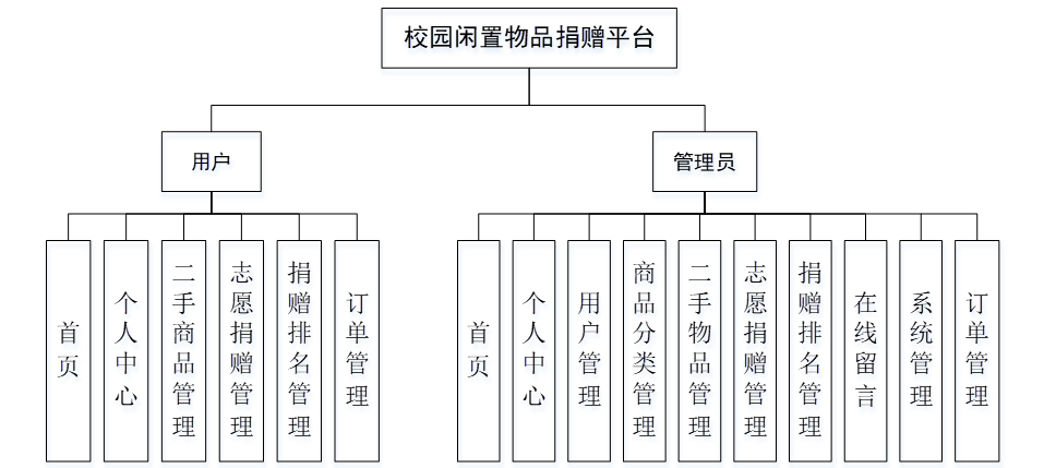 通过对本系统进行全面的环境功能的分析,能够得出基于ssm的校园闲置物品捐赠平台系统的功能模块图,如图4-1所示。