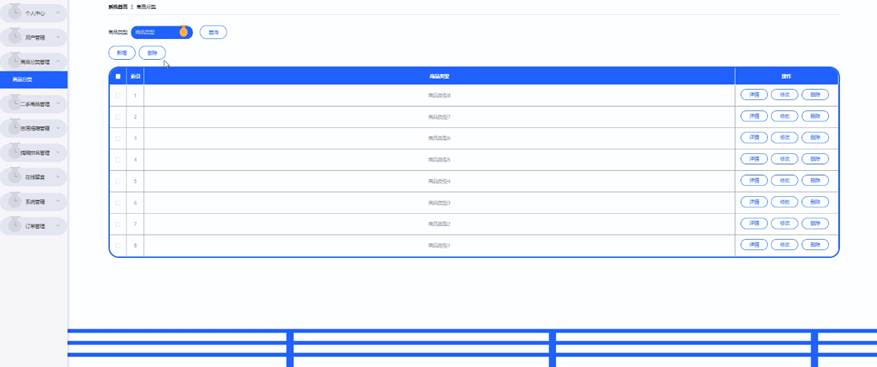商品分类管理;在商品分类页面凭借输入商品类型进行查询,新增或删除商品分类详细信息,并进行详情,修改和删除等处理;如图5-4所示。