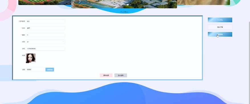 个人中心,用户许可在登录之后进入系统查看个人信息,并进行个人信息和密码进行修改,如图5-11所示。