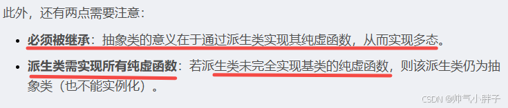 - 抽象类不一定需要纯虚析构函数:多数抽象类通过其他纯虚函数(如